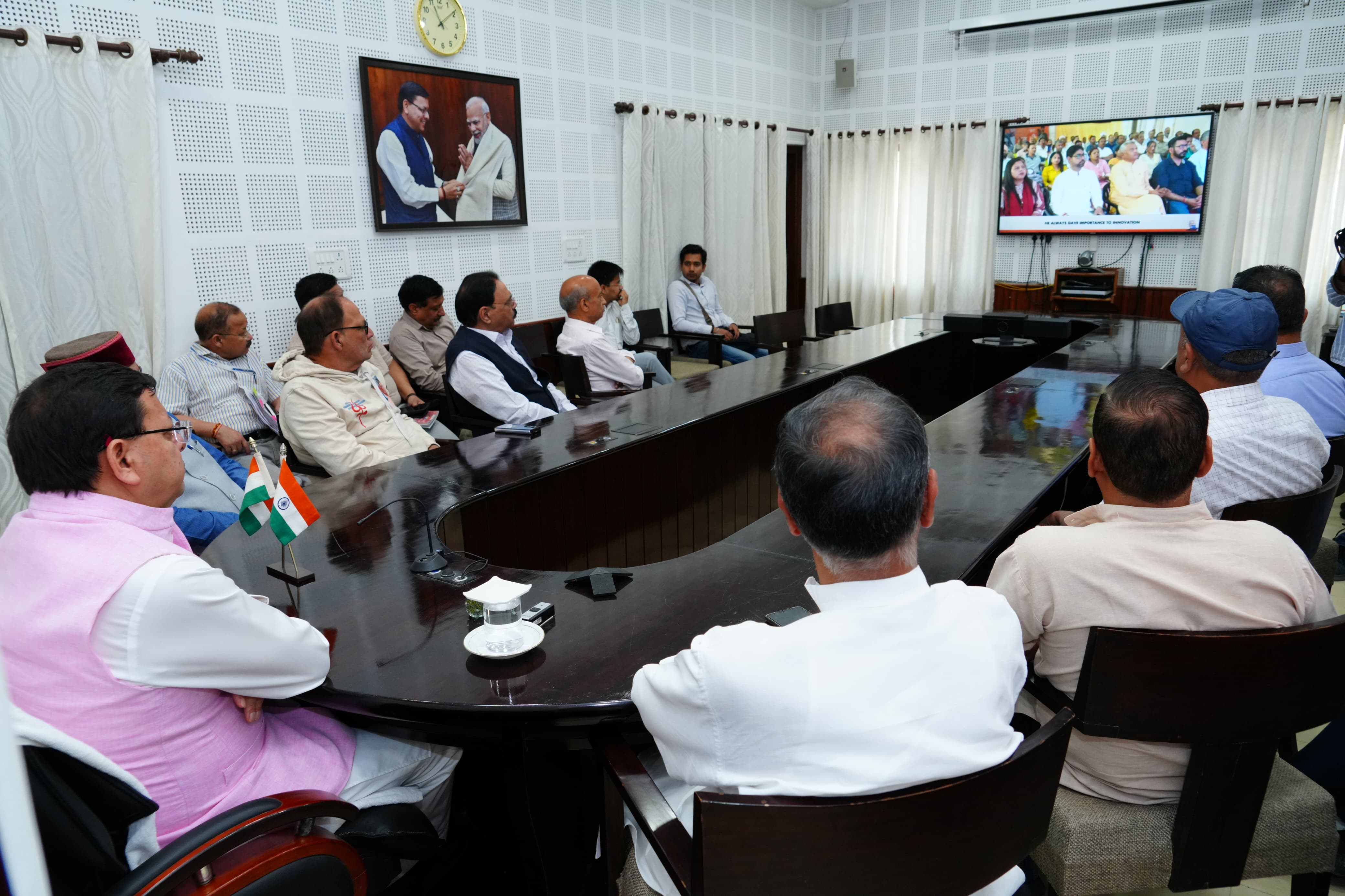 मुख्यमंत्री श्री पुष्कर सिंह धामी ने रविवार को मुख्यमंत्री कैंप कार्यालय में प्रधानमंत्री श्री नरेंद्र मोदी द्वारा प्रस्तुत \'मन की बात\' कार्यक्रम के 121वें संस्करण को सामूहिक रूप से सुना।